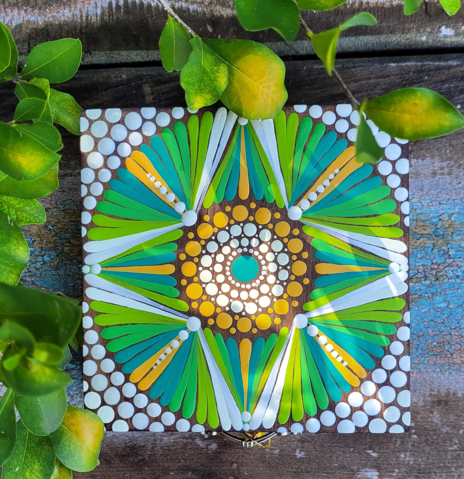 Caixa MDF 14x14x5cm toda pintada a mão com técnica mista e pontilismo.