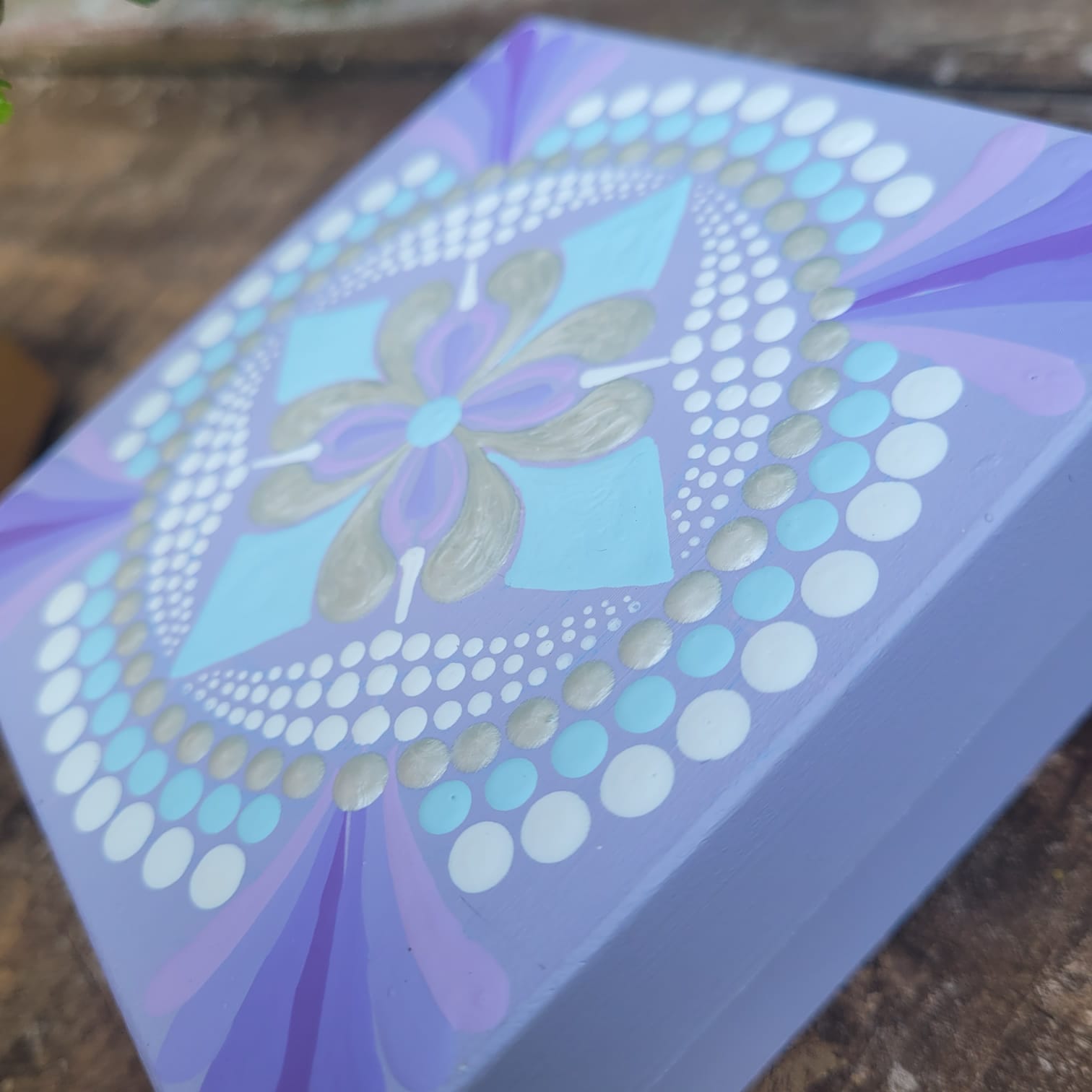 Caixa em MDF 10x10cm toda pintada a mão com técnica mista de pontilismo.