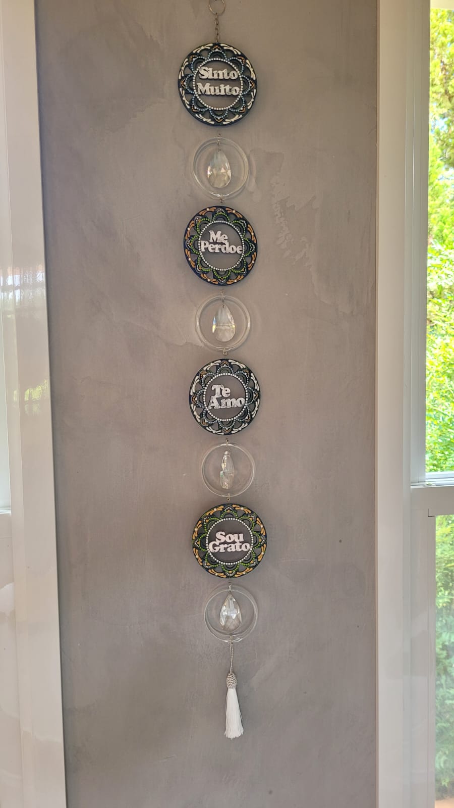 Móbile Ho`oponopono em MDF com cristais verdadeiris Swarovski e tassel em fio de seda.